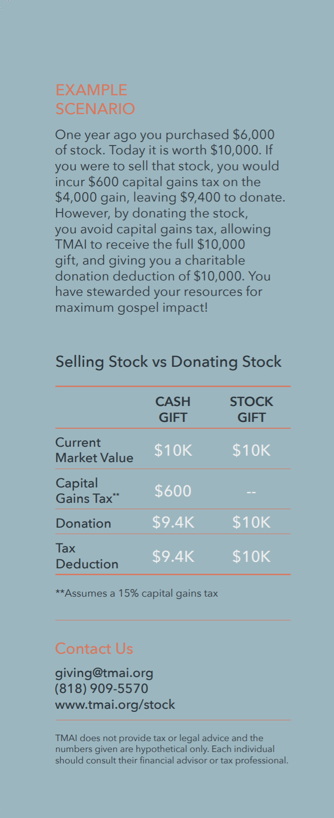 Donating appreciated stock to TMAI is a simple and tax-wise way to maximize your gospel impact. By giving stock, you can claim a charitable deduction for the full current market value and avoid paying capital gains tax. This allows you to give more - without increasing your out-of-pocket costs - so that more resources go directly toward training pastors and strengthening churches worldwide.